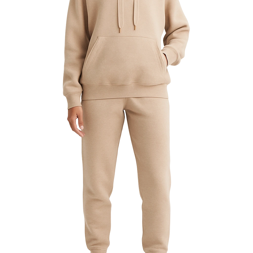 Fleece, cotton-spandex, or recycled blends styled for casual wear
