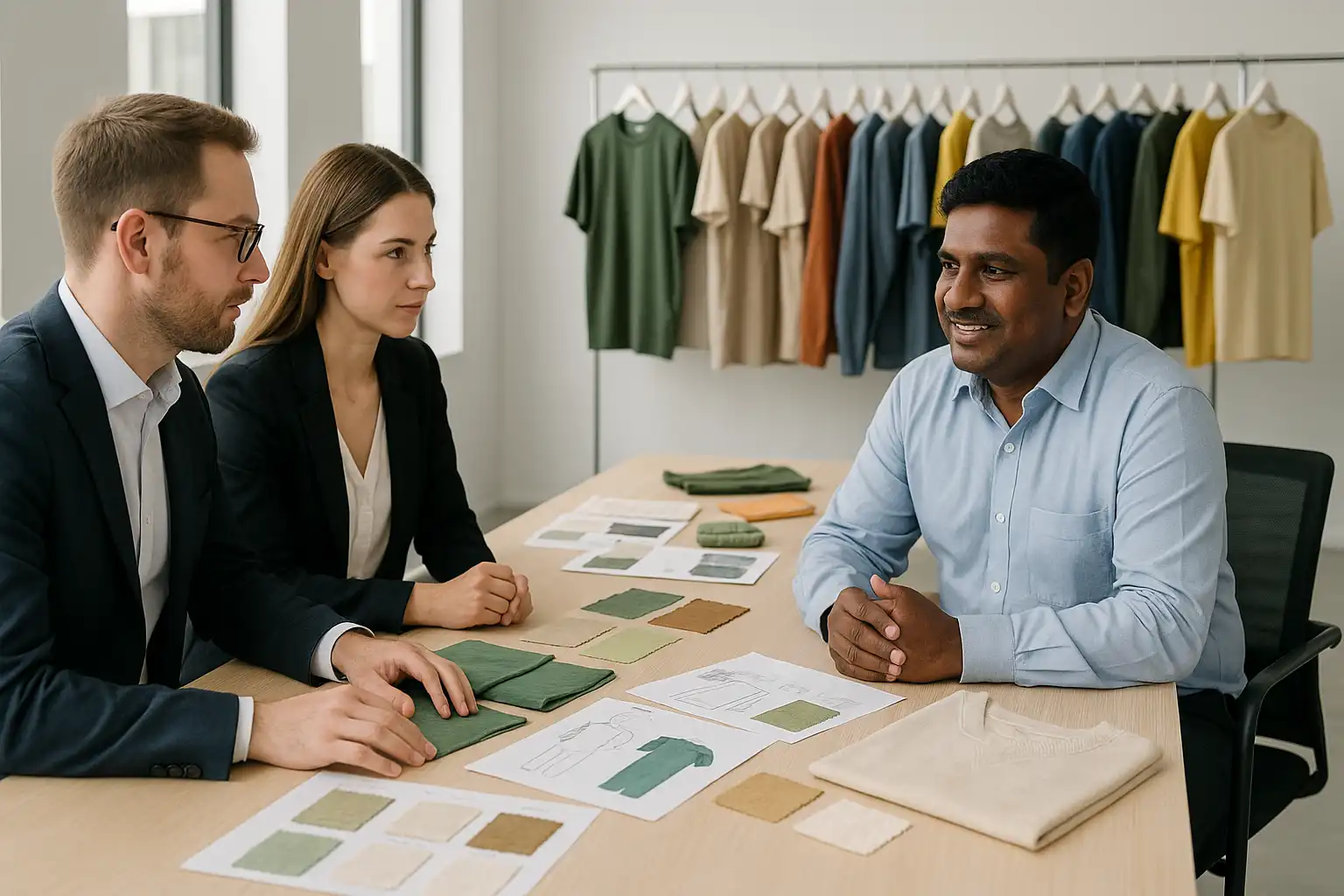 Unser Team in Tiruppur begleitet Sie von der Stoffauswahl und Tech-Pack-Erstellung bis hin zu zertifizierter Herstellung und globalem Versand.